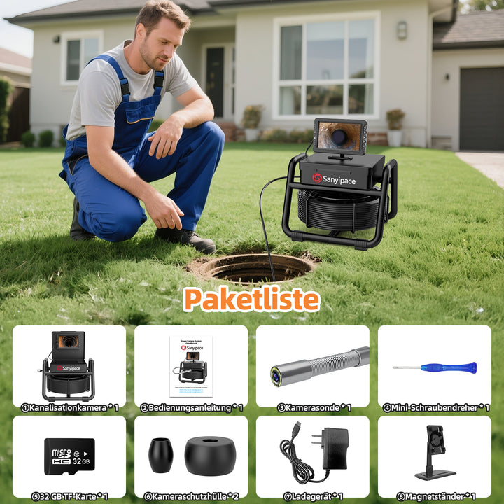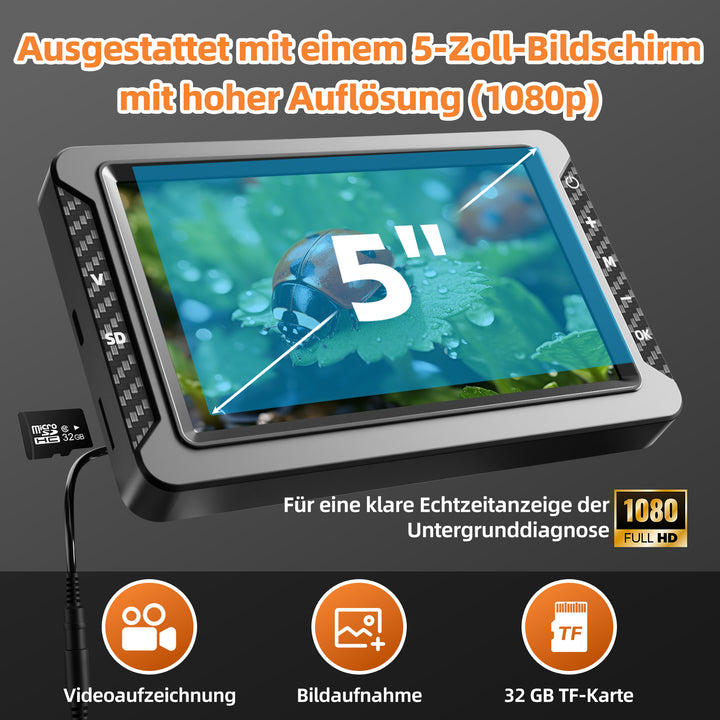 Unsere Kanalisation-Kamera ist mit einem hochwertigen 5-Zoll-Bildschirm mit einer Auflösung von 1080p ausgestattet, der klare, scharfe Bilder und Videos für eine effektive Untergrunddiagnose liefert. Mit den integrierten Funktionen zur Videoaufzeichnung und Bildaufnahme können Sie Ihre Inspektionen mühelos dokumentieren. Nehmen Sie Videos in Echtzeit auf und machen Sie hochauflösende Bilder für die spätere Analyse oder Berichterstellung. Damit Sie über genügend Speicherplatz für Ihr gesamtes Filmmaterial verfügen, wird die Rohrkamera mit einer 32-GB-TF-Karte geliefert, die reichlich Platz für Videoaufnahmen und Bilder bietet.