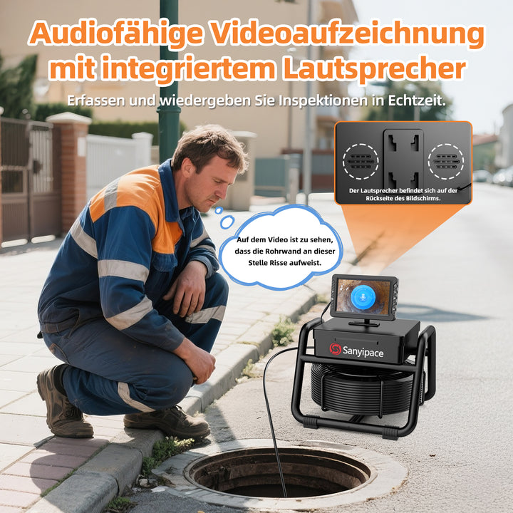 Die Sanyipace-Abflusskamera verfügt über ein integriertes Mikrofon und einen Lautsprecher, sodass Sie während der Inspektionen Audioaufnahmen machen können, um eine detailliertere Dokumentation zu erhalten. Diese integrierte Funktion vereinfacht den Aufnahmevorgang und verbessert Ihre Möglichkeiten, das Filmmaterial mit Ton zu analysieren. Darüber hinaus werden Datum, Uhrzeit und Stromwarnungen direkt auf dem Bildschirm angezeigt, sodass Sie den Überblick behalten.