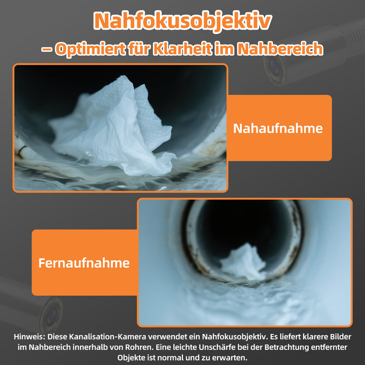 Hinweis: Diese Kanalisation-Kamera verwendet ein Nahfokusobjektiv. Es liefert klarere Bilder im Nahbereich innerhalb von Rohren. Eine leichte Unschärfe bei der Betrachtung entfernter Objekte ist normal und zu erwarten.